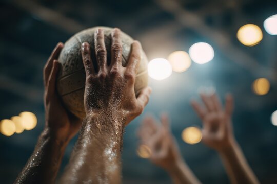 Basketball above reaching hands on black, dramatic contrast and directional light, sharp ball texture, shallow depth of field, energetic minimal sports branding