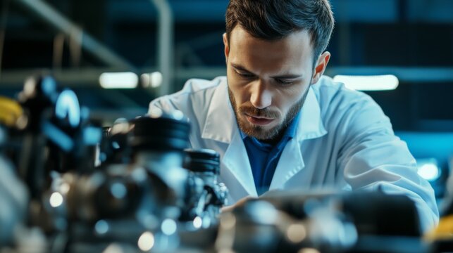 A Man in a Lab Coat Examining Machinery in an Industrial Setting