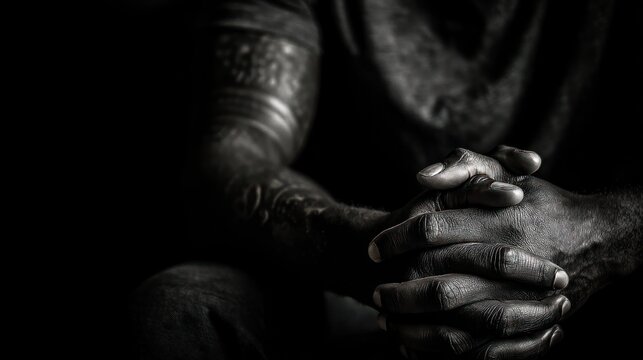 Focus on the subject's hands clasped together or resting on his lap, with lighting that casts intricate shadows, adding depth and narrative to the composition