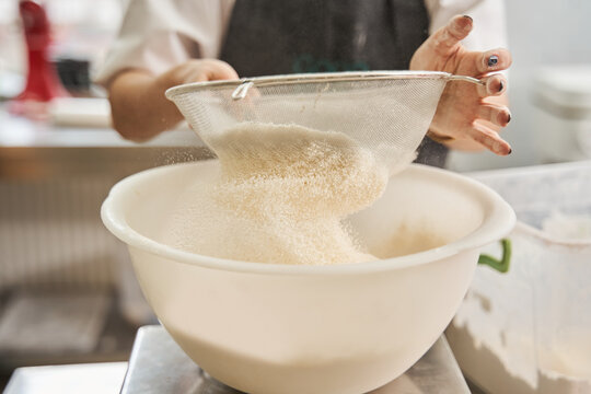 Woman hands sifting flour with flour filter while preparing dough at the table