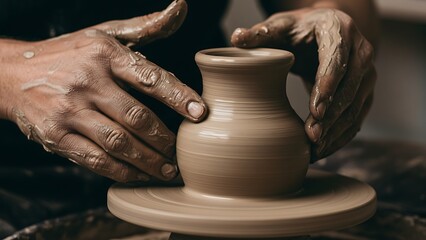 Close-up of hands shaping a clay pot on a potter s wheel in traditional craft workshop