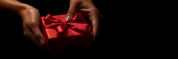 hands delicately tying a bow on a gift box, the care taken in preparing a gift wide banner, black background