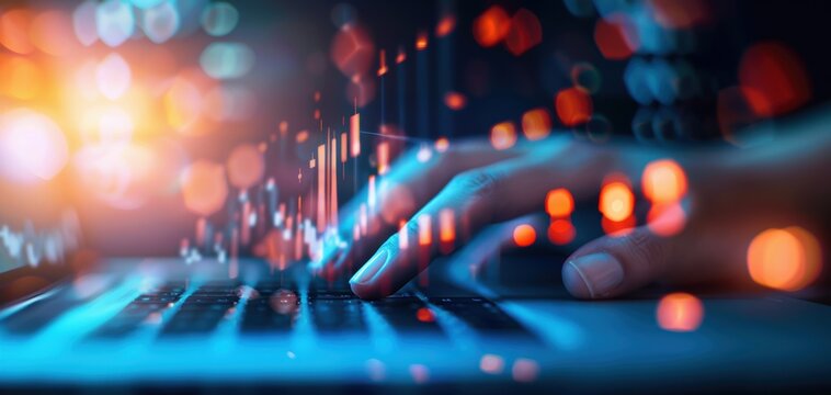 Hands Typing on Laptop with Colorful LED Light Effects and Digital World Map Visualization in Background, Representing Technology and Connectivity in the Modern Age