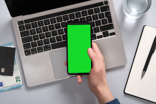 Person holds a smartphone with a green screen above a laptop on a table. Nearby a notepad, euro bills, a glass of water. Place to mocap your application, website