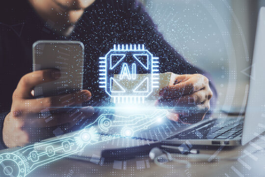 AI (Artificial Intelligence) concept. deep learning. Double exposure hands typing laptop.