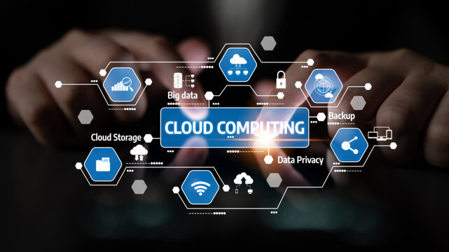 A person working on a laptop displaying cloud computing technology, exploring data storage concepts in a professional office environment. Emphasizes innovation, technology, and connectivity.