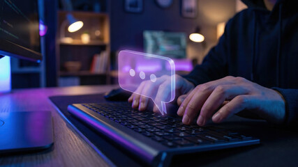 Hacker typing on keyboard in dim home office with glowing chat bubble overlay conveying cyber communication and tense atmosphere