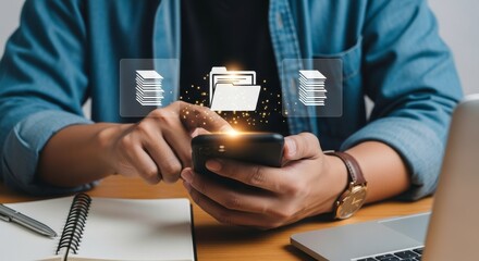 A person with a blue shirt uses a mobile phone with a rising bar graph and arrow overlay, suggesting growth or progress