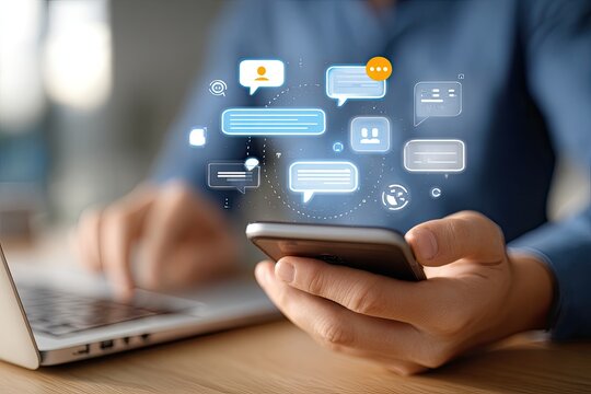 Person using smartphone with glowing live chat speech bubble overlay mobile phone hand