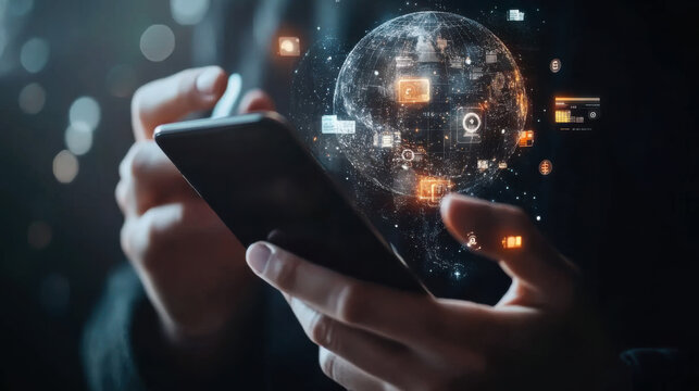 A person engaging with a smartphone while digital icons and a globe are projected in a dark environment, reflecting technology and connectivity
