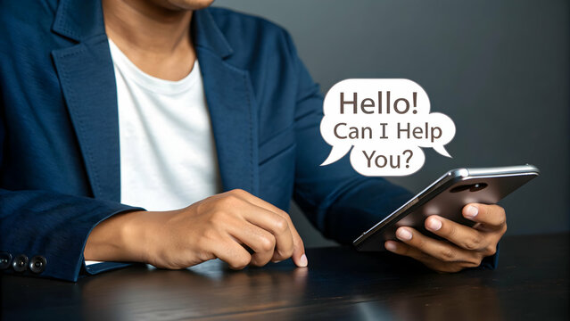 Young man using a smartphone with digital icons representing technology and communication
