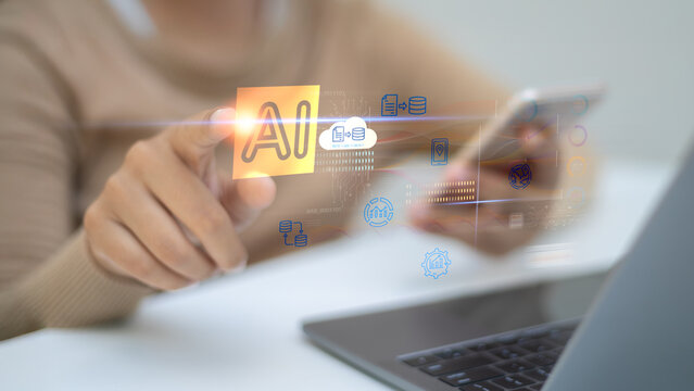 Hand pointing on virtual AI interface with data analytics icons, using smartphone and laptop
