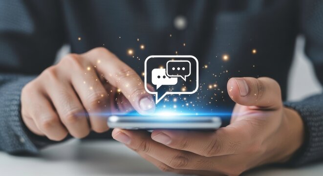 Person using a smartphone with a chat bubble icon and sparkling effects overlayed