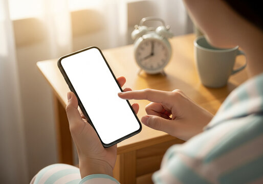 Close-up of a person's hands holding a smartphone with a blank white screen, ready for use