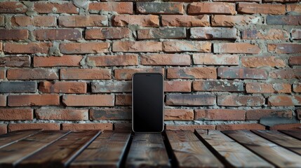 Mockup image of hand holding white mobile phone with blank black screen with white brick wall background