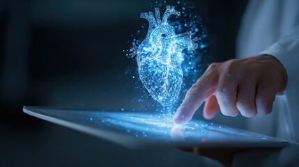 hand using tablet with creative glowing blue medical hologram medicine technology concept double exposure no logos no brands ar 169
