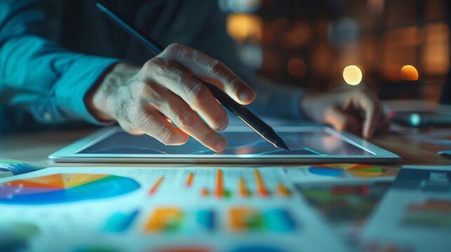 close up of hand using stylus on tablet screen displaying colorful data charts, with blurred bokeh lights in background, creating modern and dynamic atmosphere