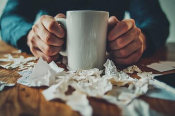 Close-up of tired hands holding a coffee cup. The desk was full of crumpled notes and documents. Tell stories quietly Of burnout and long hours.