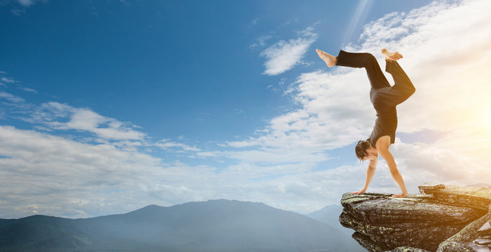 Man doing handstand on rocky cliff at sunrise over foggy valley