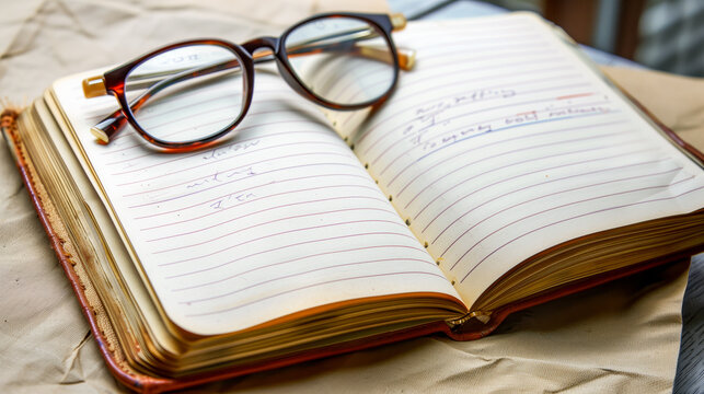 A pair of eyeglasses resting on an open lined notebook with handwritten notes, creating a reflective and intellectual atmosphere.