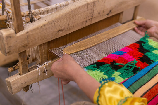 tapestry weaving process on a traditional wooden handloom