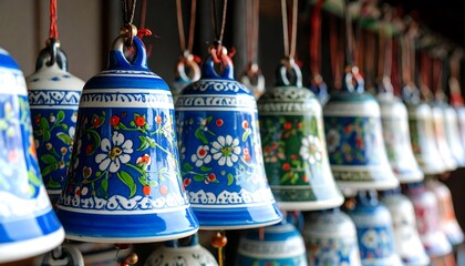 Decorative ceramic bells hanging in a row