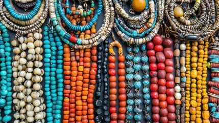 Beaded necklaces hanging at a market stall