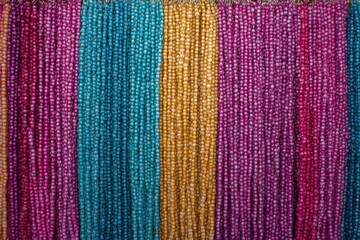 Colorful bead necklaces hanging in vibrant rows