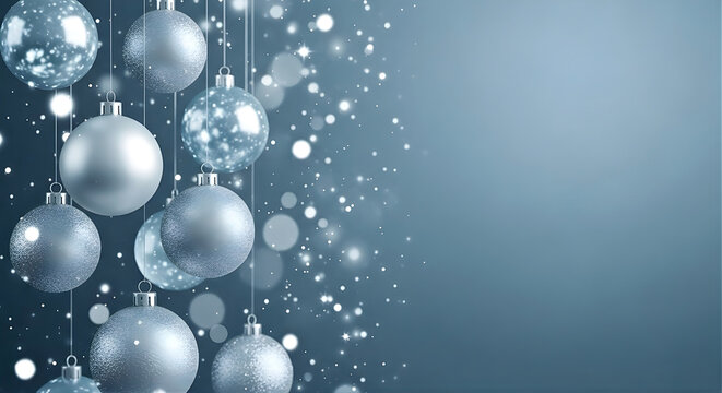 Silver Christmas Balls Hanging on Snowy Background. Sparkling silver ornaments hanging beautifully with falling snow for a modern Christmas scene.