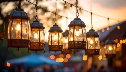Photo of string lights hanging on tree in the garden at evening time. Fashion decoration with bulbs for night summer party.