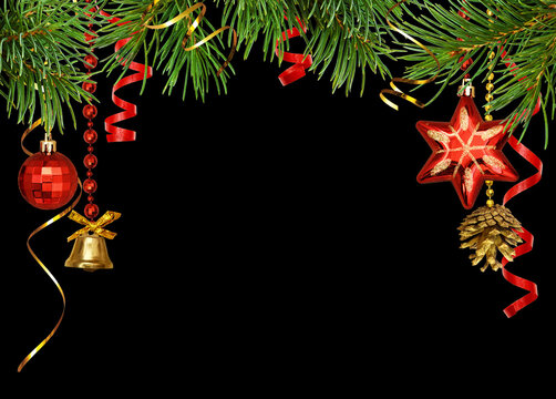 Green pine twigs, red and golden decorations for Christmas top border isolated on black