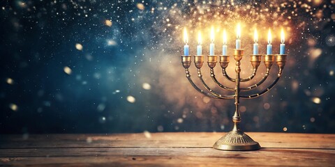 Festive hanukkah calligraphy with menorah and candles illuminated with sparkling light