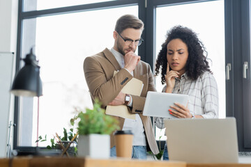 Diverse professionals reviewing documents in positive workplace atmosphere