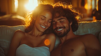 A romantic couple, smiling happily while embracing on a couch during sunset, showcasing their joy in a cozy environment. They appear to be of European descent.