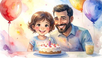 Watercolor cartoon of family celebrating 3rd birthday with balloons and cake, cheerful fun.