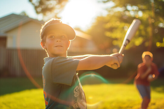 close up child wearing baseball cap and holding baseball bat in park, a boy playing baseball outdoor