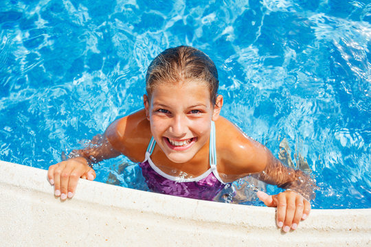 Oudoor summer activity. Concept of fun, health and vacation. A happy boy eight years old in swimming goggles is holding onto the side of the pool on a hot summer day.