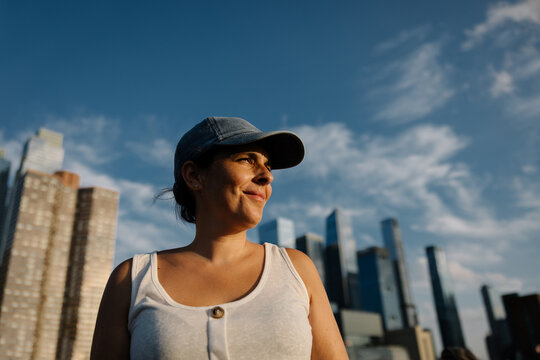 Young man breathes fresh air in natural atmosphere. Adult guy tilts head up and closes eyes in forest and blue sky. He enjoys vacation, meditates, feels calm.