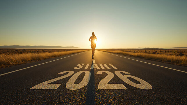 New year resolution 2025 concept. Word start 2025 written on athletics track and athlete woman runner preparing for new year at sunset for challenge and change. planning health and the goal to success