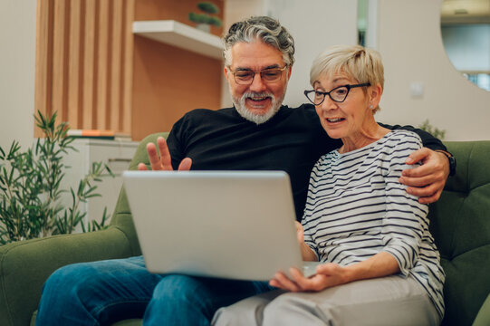 Senior couple using laptop while sitting on a couch at home