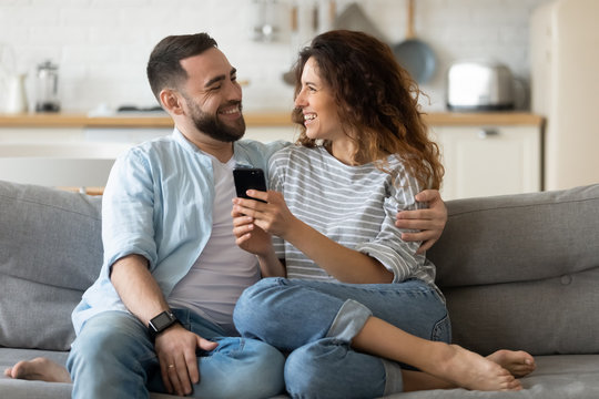 Happy millennial couple sit relax on couch in living room watching video on cellphone together, smiling young husband and wife rest on sofa at home browsing Internet using modern phone device