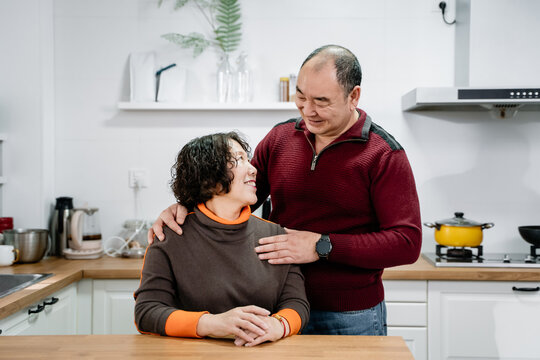 Happy couple interacting in bright kitchen interior