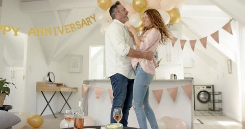 Joyful couple dancing in modern kitchen for a moment of celebration