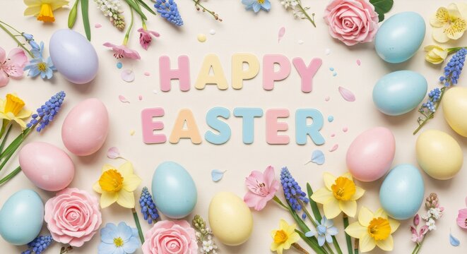 Happy Easter message with colorful eggs and spring flowers on white background. Flat lay greeting card for Easter holiday celebration with copy space