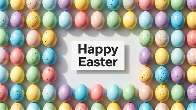 Colorful pastel easter eggs arranged in circle on blue background with happy easter text