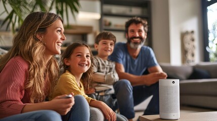 A family of four gathered around a tablet in the living room, parents and children engaged and smiling