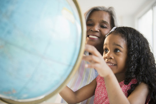 African American grandmother and granddaughter looking at globe