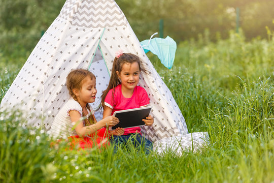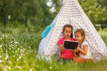 children playing in tablet pc in a tent