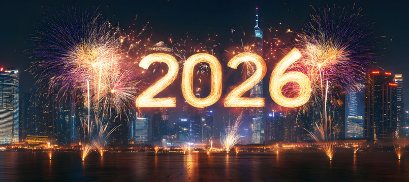 Fireworks display with the numbers "2026" in bold letters against an urban skyline at night, creating a festive atmosphere for the New Year's celebration