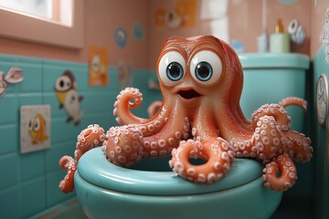 Cute cartoon octopus with large eyes sitting in a teal bathroom sink surrounded by toys
